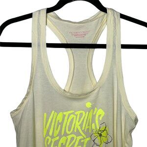 Eye-catching racerback tank top from Victoria’s Secret in a light yellow with bold neon pink and green lettering. Features a tropical flower graphic, scoop neck, and soft-stretch feel perfect for the gym, running errands, or summer lounging. Size Small. In good preowned condition with minor wash wear — see photos.