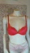 Bra features low front with pink underlayer and red lace overlay. Adjustable straps and back closure. 34B.