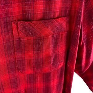 Excellent preowned condition. Red plaid flannel collared button up lounge top. Has pink tinsel throughout. Cotton/viscose blend material. Approx. measurements: Shoulder to hem 25", pit to pit 23", sleeve from neck to sleeve hem 30". Size M.