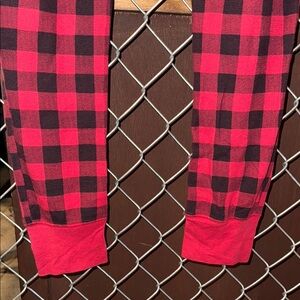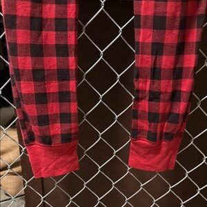 Cozy red plaid onesie with button front. Features a cute dog logo on the chest.