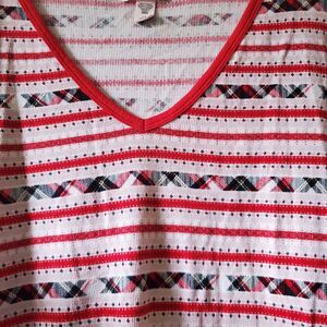 Victorias Secret Red Plaid Striped Waffle Knit T-shirt V Neck Size Large Cozy