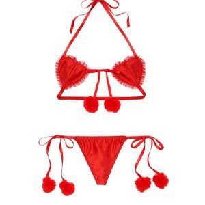 Victoria's Secret Red Satin Tulle Pom poms Heartbreaker Lingerie Set