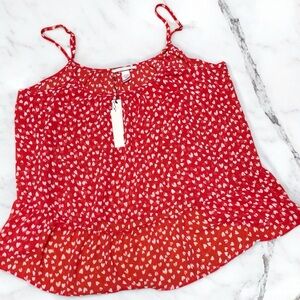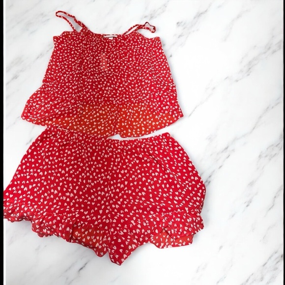 Experience ultimate comfort with this Victoria's Secret pajama set, featuring a vibrant red color adorned with charming white heart prints. The set includes a camisole-style top with delicate spaghetti straps and flowy shorts with a playful ruffled hem, crafted from lightweight fabric perfect for lounging or sleeping.