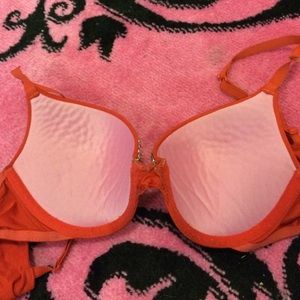 Ladybug red Victoria's Secret bra. Worn previously and has a tear on the middle inside but makes no difference. Lightly padded. I bedazzled it myself for New Years. 36B