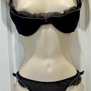 NWOT Vintage Victoria’s Secret Rhinestone Bra and Matching Panty Set. Push-up with underwire and lightly lined. Panty has a V string. Both top and bottom are adorned with rhinestone trim along swirls of black mesh.