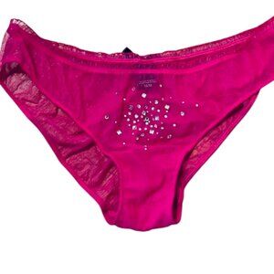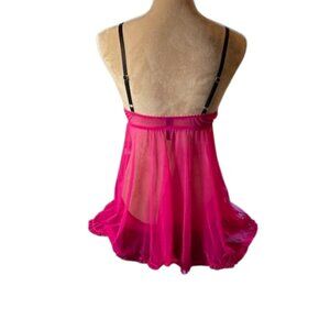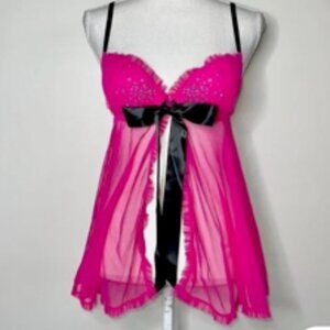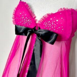 Victoria's Secret Sexy Little Things, Hot pink tulle mesh rhinestone/crystal studded babydoll ruffled flyaway. Open front design, black satin ribbon accent, underwire padded push up cups with front hook closure, adjustable straps, back elastic. Padded cups are opaque the body is sheer mesh. Matching rhinestone studded panties, ruffled elastic waistband, back ruching and black satin bow accent. Cotton crotch, the rest is completely sheer mesh. Tag dated 6/11.