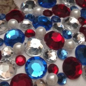 Red, blue, & clear rhinestones covering a white 32 C bra. Pearls hanging from the middle to the sides of bra. Bra does have push up. Comes with bra & some red, white, & blue kandi! Worn only once before to Beyond Wonderland.