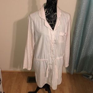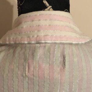 Pink and white striped with gray and silver.. has all buttons and string but it does have a hole in the back at the tag (pictured).. my favorite part is that it is thin