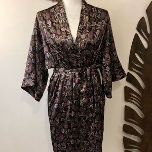 Victoria’s Secret Satin Robe in like new condition. Black with paisley floral print. Inside tie along with the outer sash tie. Pockets at seams. Wide kimono-like sleeves. Knee length. So sleek and soft.