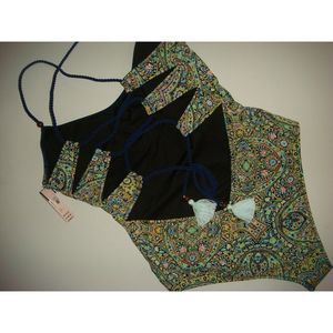 For sale is a BEAUTIFUL NWT Victoria's Secret Small lace-up one-piece+Small romper cover up in mosaic garden