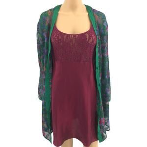 Satin burgundy purple adjustable spaghetti strap babydoll shift slip dress chemise with lace bodice, chiffon green sheer embroidered long sleeve button up robe with satin trim