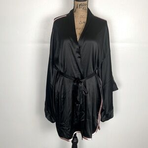 Victoria’s Secret Satin Robe. Size M/L. Long Sleeve. Women’s. Color Black Pink Trim. Transparent sides. High Gloss. Lace up. Material content in images. Made in China. New with tag.