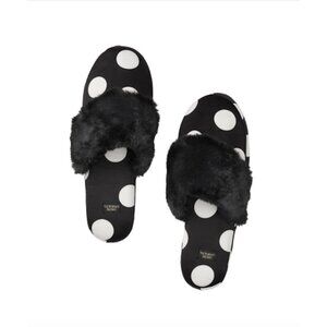 Victoria's Secret Signature Satin Slippers Black White Polka Dot with Faux Fur