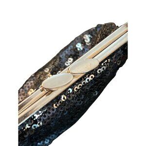 A sophisticated evening clutch that elevates any formal ensemble with its intricate sequin design. The metallic blue and black color palette creates a dynamic, shimmering effect, while the structured frame and elegant clasp provide a polished finish for sophisticated occasions.
