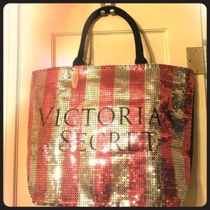 This BNWT, extra-large, Limited Edition tote from Victoria's Secret has the classic pink and white stripes (pink and silver sequin here) and the brand logo on display. Zippered closure, dual shoulder straps and satin black liner. Only out of the original packaging for pictures. I have too many and must let some go. Sad day for me but a buyers dream! These bags are no longer available for purchase. Grab it before it's gone!!