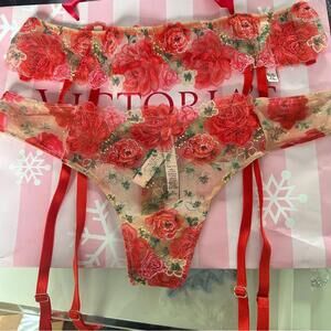 Victoria's Secret Set Lace Garter Belt / Thong Panty Floral Embroidery Red