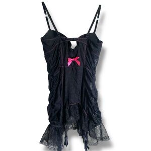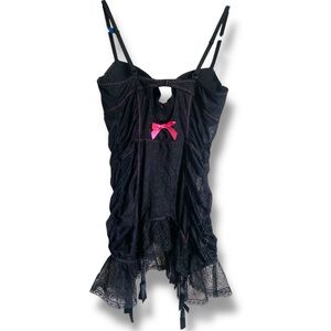 This alluring chemise combines the elegance of black lace adorn with a playful pink bow accent. Lightly padded. The adjustable spaghetti straps and ruffled hem add a touch of femininity to this intimate slip. Hook and eye adjustable back strap. Super sexy and flirty
