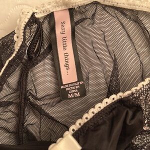 Victoria’s Secret Sexy Little Things satin mesh lace and rhinestone panty. Black with white trim. Sample from when my friend was a designer for VS. Smoke free home
