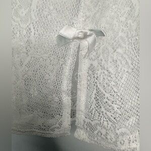 Delicate Sheer White Lace with Adjustable Straps. Intricate White Ribbon Crisscross Back. Side Slits Adorned with Bows. New Without Tags!