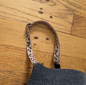 Stylish shimmering black bra with leopard print straps.