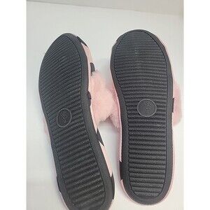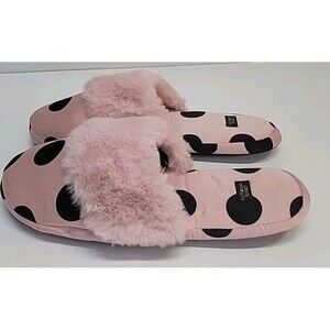 The product is a pair of Victoria's Secret Signature Satin Pink slippers with black polka dots, designed for women in size M. These bedroom slippers feature a solid pink color with a polka dot pattern, made of satin material with a faux fur upper. The slipper style has a flat heel height, perfect for lounging in the bedroom. The classic theme and comfortable design make them a stylish and cozy addition to any woman's wardrobe.