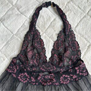 Details: Vintage chiffon lace, this bedtime-chic mood is less about naughty negligées and more nuanced. Crafted from paper-thin fabrications, this sheer 100% polyester slip feels like a light lace. Allover mesh look with floral embroidery on the cups. Easy to mix and match. Halter strap has a gold hook and loop closure. Elastic, open back. This is a silver label piece from 2010.