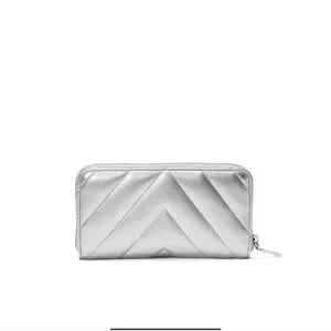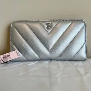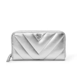 This stylish wallet from Victoria's Secret features a chic chevron quilted design in a shimmering silver finish. Its sleek and modern look is enhanced by a secure zip-around closure, making it a perfect accessory for both casual and formal settings.