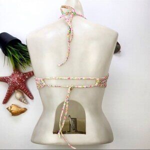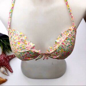 Victoria's Secret swim top with multicolor/confetti speckles and gold foil. Ruffles along cups with decorative bow at front center. Halter neck tie with adjustable looped back tie. Size 34D, Some padding.