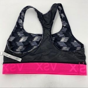 Wide band with VSX logo. No padding. Moisture wicking fabric lines bra.