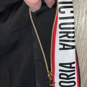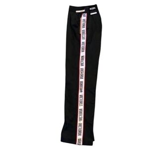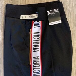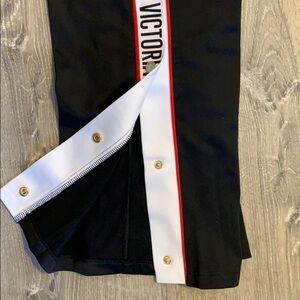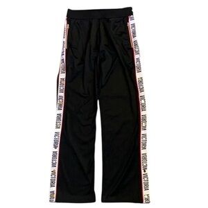 Black track pants with red & white stripes down outside of legs and VICTORIA in black. Also has snaps down each leg. Two front pockets that zip. Approximate flat lay measurements: