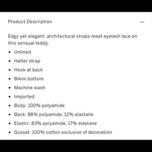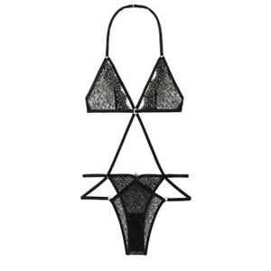 Victoria’s Secret Very Sexy Strappy Lace Teddy. Edgy yet Elegant with eyelash Lace. Unlined, Halter Strap, Hook at Back, Bikini Bottom. Material Content: Body - 100% Polyamide; Back: 88% Polyamide, 12% Elastane; Elastic: 83% Polyamide, 17% Elastane; Gusset: 100% Cotton exclusive of decoration. New with Tag