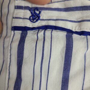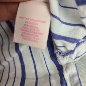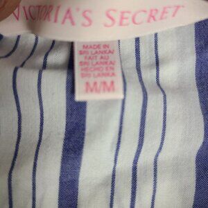 This is a Victoria's Secret women's pajama top in size medium with a striped pattern in shades of blue. The top features long sleeves and a button-front design, making it comfortable and easy to wear for lounging or sleeping. The colorful striped pattern adds a fun and stylish touch to the pajama top, perfect for adding a pop of color to your sleepwear collection.