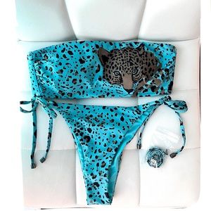 Victoria's Secret Swim Set Strappy Ruched Brazilian Blue Leopard 2 Piece S NEW