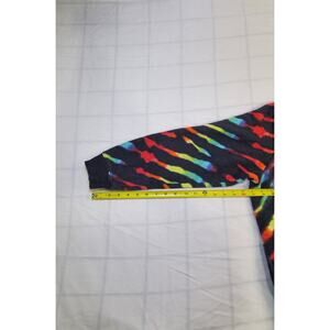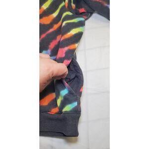 The sweatshirt is made of 60% cotton and 40% polyester, with 100% polyester lining material. It is lined and machine washable with a striped pattern and embroidered accents. The colorful rainbow dye design adds a fun touch to your activewear or casual outfit.