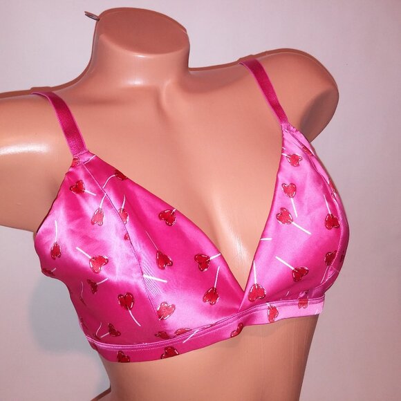 Victoria’s Secret Tease Collection satin bralette featuring a playful pink base with red lollipop heart print. Soft, lightweight, and comfortable with a flattering triangle silhouette.