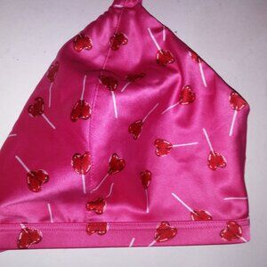 Victoria’s Secret Tease Collection satin bralette featuring a playful pink base with red lollipop heart print. Soft, lightweight, and comfortable with a flattering triangle silhouette.