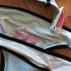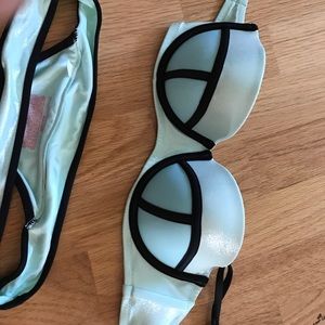 Brand new without tags, never worn, with detachable/adjustable straps! Light Aqua/mint color with metallic/sparkly panels and matte panels, outlined in a satin-y black. The top is 34c (see third picture) and bottom is S. Could be worn several ways! Very cute - Victoria's Secret has now discontinued their swim line so not sure what the MSRP would be!