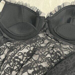 Add elegance and allure to your lingerie collection with this authentic Victoria’s Secret “The Lacie” black lace babydoll chemise. Designed with a sheer floral lace body, lightly padded cups for gentle support, adjustable spaghetti straps, and a delicate ruffled hem for a feminine finish. The open-back bow and layered ruffle detail add a romantic and sexy touch. Perfect for sleepwear, boudoir photos, or a special night.