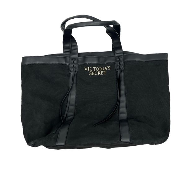 Victoria's Secret Tote Black large no close bag braided tassel gold logo travel