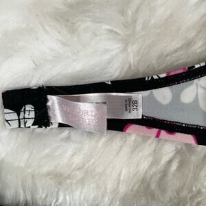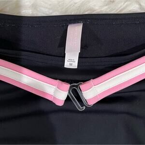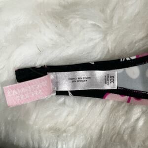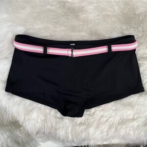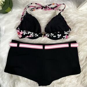 New Y2K Flattering Black, Pink, and White Tropical Floral Victoria’s Secret Swimwear Two Piece Swimsuit Featuring a Lightly Padded Push-Up Bikini Swim Bra Top and Belted Cheeky Boy Shorts Swimsuit Bottoms. Removable Pink and White Belt. Swimsuit Top is Women’s Size 32B and Cheeky Shorts are Size Medium.