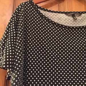 Size small, fits more like a medium. Very cute with leggings. Casual look. T shirt material. Dark blue and white. Almost looks black but pretty sure it's blue. Can be worn off the shoulder for a fun, flirty look. No rips or stains. Good condition.