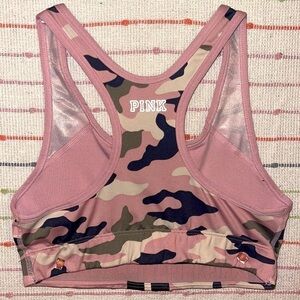 Victoria’s Secret- Ultimate Unlined Racerback Sports Bra. Color: camouflage in pink, gray, green and white. Compression fit. Not padded. Racerback style. Very good condition. Pet and smoke free home.