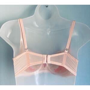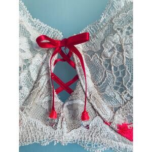 BEAUTIFUL unlined demi bra from Victoria's Secret, NWOT. Bra is semi sheer. Is a beautiful coral red color with cream/light beige. Lace pattern is floral. Beautiful bow and lace up detail at center gore with crystal detail. Straps are fully adjustable. Bra was produced in 2012 so only available here! See pictures for condition. Smoke free home. Offers and questions are welcome!