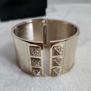 NWT Victoria's Secret VS Gold Toned Scandalous Rhinestone Cuff Hinged Bracelet. Limited Edition. 6 squared embellishments with triangle peaks, logo on back of bracelet. Plastic still intact for protection. In original box with padding. Brand new, never worn!