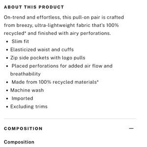On-trend and effortless, this pull-on pair is crafted from breezy, ultra-lightweight fabric that's 100% recycled* and finished with airy perforations.