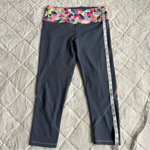 Details: Capri leggings with neon geometric pattern at waist and behind the knee panels ( those are a mesh), draw-pull in front, key, slit pocket inside waistband in back. High rise waist, compression style, holds everything really wonderfully!