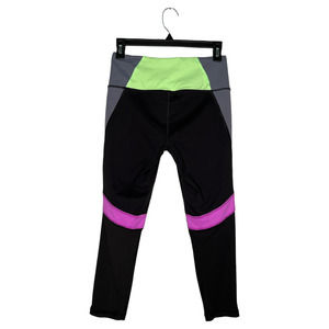 Great pair of Victoria's Secret VSX Sport Knockout capri leggings. Vibrant color block pattern of pink, green and gray with mesh calves. Pocket at seam back right.