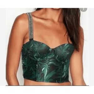 Gorgeous green and black floral bustier in brand new condition. Beautiful crystal detailing on adjustable straps. Side zipper closure. Built in boning. Smoke free home. Fast and careful shipping!