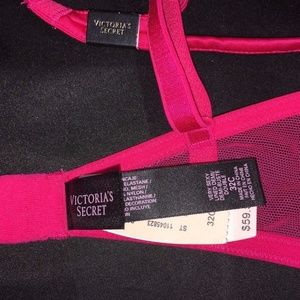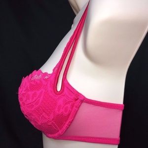 This Victoria's Secret Very Sexy lined demi bra is size 32C and NWT! The bra is magenta and lace patterned with mesh sections on the wings. In between the two cups there is a cream colored mesh section. No stains, tears or flaws were noted!