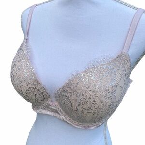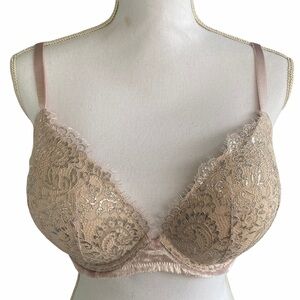 Victoria’s Secret Very Sexy Push Up Bra-Women’s Size 34DDD. Blush Pink with a Silver Metallic lace overlay and Pink Velvet trim. Thick padding provides a big lift for enhanced cleavage. Almost no wear on this bra-mesh, straps, lace is all in excellent preowned condition. This is a stunning bra-the pictures for not do it justice!